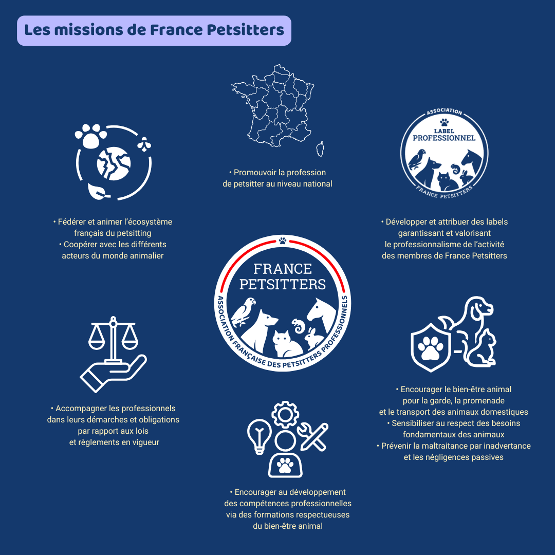 Le visuel ci-dessous rappelle les missions essentielles de France Petsitters, qui guideront les actions du Conseil d’Administration au cours des trois prochaines années :